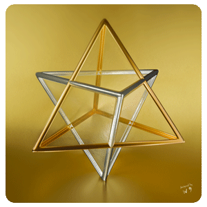 Du siehst hier eine Darstellung des „Sterntetraeders“. Diese Figur entsteht, wenn zwei Tetraeder einander durchdringen. Es ist die erste „Merkabah“, ein Gefährt für die Seele. Es öffnet dir die Dimension der Zeit und ermöglicht deinem Geist, sowohl in die Vergangenheit, als auch in die Zukunft zu reisen.