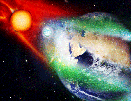Das besondere an der venusischen Erdnähe ist folgendes: Die Venus befindet sich dann genau zwischen der Erde und der Sonne. Das bedeutet, dass die Strahlung der Sonne zuerst über die Venus läuft, ehe sie in die Erdatmosphäre einströmt. Die Sonnenstrahlung nimmt dabei Myriaden an venusischen Partikeln mit und überträgt diese in das energetische Feld der Mutter Erde. Wir erleben daher einen äußerst intensiven Venus-Download (siehe bildhafte Darstellung dieses Ereignisses).