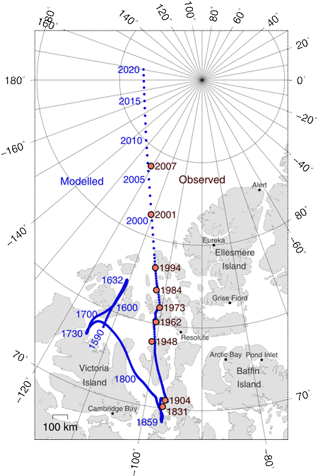 Die blaue Linie zeigt die Wanderung des magnetischen Nordpols,