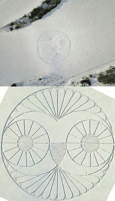 Am 2. 2. 2019 wurde in Südengland in der Nähe von Devizes eine erstaunliche Formation im Schnee gefunden. Sie symbolisiert auf eindrückliche Weise den Kopf einer Eule. Auffallend ist vor allem die Symmetrie, die Betonung der Zahl Zwei, in Kombination mit dem Entdeckungsdatum, dem 2. 2.!