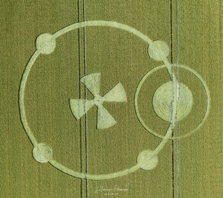 Genau an diesem 17. Juni entstand in Südengland ein Kornkreis, der diese Impulse aus der Hunab Ku beschreibt. In der Mitte des Kornkreises liegt ein gleichseitiges Kreuz, das die Strahlung der Hunab Ku darstellt. Darum herum läuft ein Ring, auf dem vier weitere Kreise und ein fünfter größerer Kreis mit einem eigenen Ring liegen. Dieser größere Kreis ist eine symbolische Darstellung der Erde (mit der Mondbahn) im Wirkungsfeld der kosmischen Kräfte.