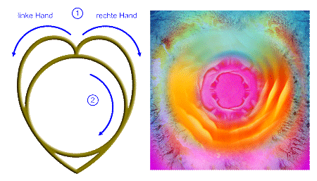 Und mehr noch: Der Ring (die Mondbahn), der um die Erde führt, passt genau drei mal in diese Formation. Die Drei steht für die Entfaltung.