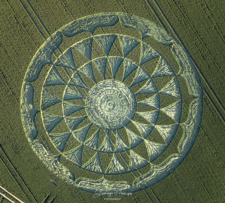 Ein weiterer Kornkreis, der gestern (25. Juni) entstanden ist, ergänzt dieses Thema. Kornkreise spielen oft auf Kalenderdaten an. Diese Formation erschien genau Acht (Liebesthema) Tage nach dem Hunab-Ku-Kornkreis. Er besteht aus einer 18-strahligen (zwei mal neun) Geometrie und neun Rosetten im äußeren Bereich. Die Neun steht für den Fluss des Lebens.