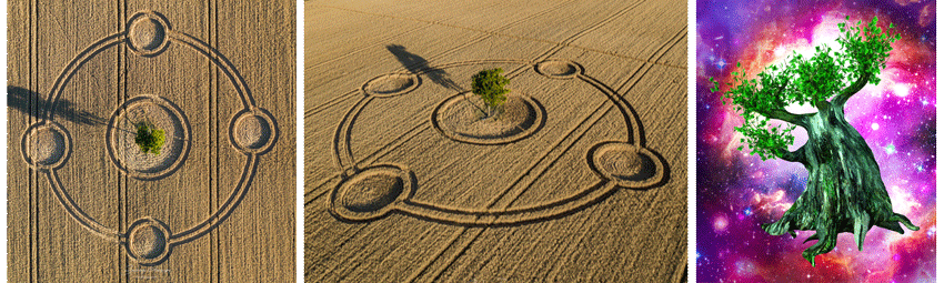 Der Kornkreis mit dem "Weltenbaum", Fotos: www.cropcircleconnector.com, Grafik: Werner Neuner