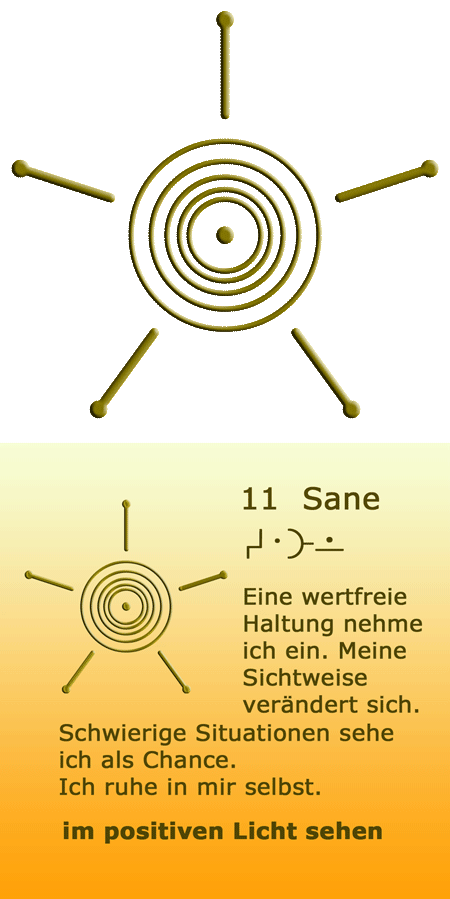 Dich stört etwas in deinem Leben, du findest eine Situation sogar bedrohlich, beängstigend, erschreckend. Schau dir das genau an. Zeichne das Symbole Sane über diese Situation. Du findest zu dir zurück, nimmst eine neutrale Haltung ein. Und plötzlich findest du einen Ausweg oder erkennst Möglichkeiten, an die du noch nicht gedacht hattest.