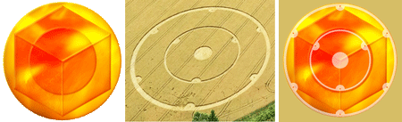 Wenn wir die Geometrie dieses Kornkreises anschauen, so sehen wir, dass es sich um eine „Projektion“ des Würfels handelt, mit seiner „Außenkugel“ und seiner „Innenkugel“. Der Würfel ist der mittlere der fünf platonischen Körper. Also wieder die innere Mitte.