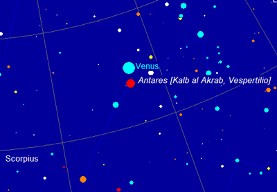 Antares ist der Stern im „Herzen des Skorpions“. Du siehst sein rotgrünes Funkeln zurzeit nach Sonnenuntergang im Südwesten. Sein Name kommt aus dem Griechischen und bedeutet soviel wie: „Derjenige, der die Energie des Mars ausgleicht“. Also jene Kraft, die das kriegerische Element neutralisiert. Wenn sich nun die Venus am Firmament mit diesem Stern verbindet, sagt sie uns, wie das gelingen kann, nämlich mit der Liebeskraft.