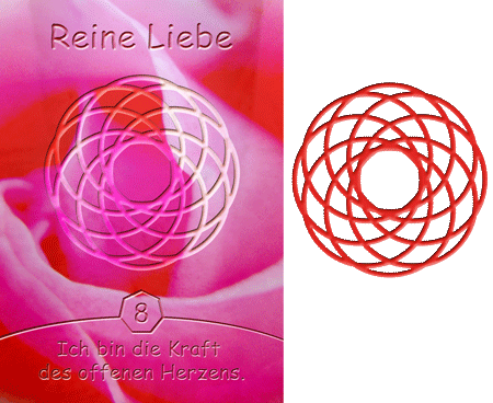 Wenn du das Symbol der „Reinen Liebe“ genau anschaust, siehst du, dass es aus 8 miteinander verwobenen Kreisen besteht. In der Mitte des Symbols entsteht ein freier Raum! Und dieser freie Raum erzählt vom Wesen der Liebe. Denn die Liebe lässt dem Liebespartner stets jenen Freiraum, der für seine/ihre Entfaltung nötig ist. Die Liebe spricht offen alles aus, die eigenen Wünsche und Sehnsüchte. Doch die Liebe erwartet nicht, dass diese Wünsche vom Partner erfüllt werden, sie lässt offen und frei. Das, so meine ich, ist ein zentrales Geheimnis der Liebe, durch das sie tiefer und weiter werden kann…