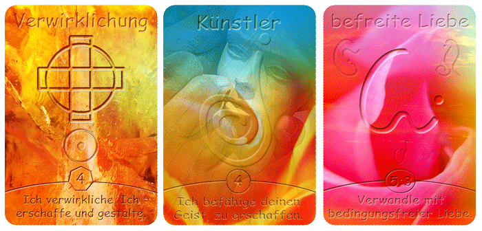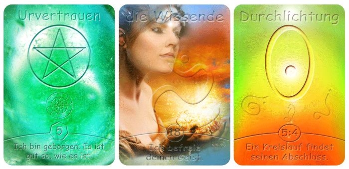 Auch diese drei Karten kannst du mit dem weichen, fließenden Blick auf dich wirken lassen. Beobachte, was du dabei fühlst. Das kann ein direkter Impuls aus deinen eigenen Seelenkräften sein.