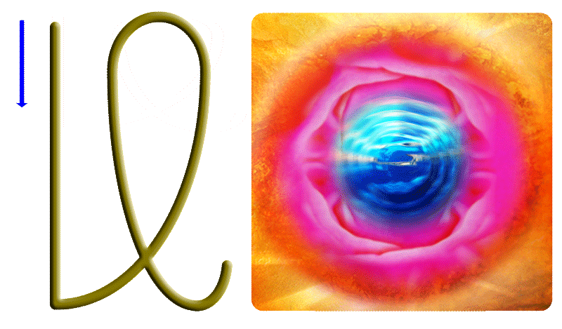 Du siehst hier im linken Teil des Bildes das Venussymbol „Selbstfindung“. Wenn du es zeichnest, beginnst du auf der linken Seite. Der Bogen führt dich dann hinab, zu deinem eigenen Urgrund hin. Dort beginnt die Innenschau und du erkennst, dass du ein kraftvolles Schöpferwesen bist. Du erkennst das vor allem dann, wenn du bereit bist, deinen „eigenen Schatten“, deine eigenen Schattenwelten zu umarmen. Dann nämlich beginnt dein Urgrund zu leuchten. Von dort unten zieht das Symbol der Selbstfindung wieder empor. Mit der Schleife transformierst du all das, was dich bislang daran gehindert hatte, deine eigenen Innenwelten zu betreten. Danach steigst du empor.